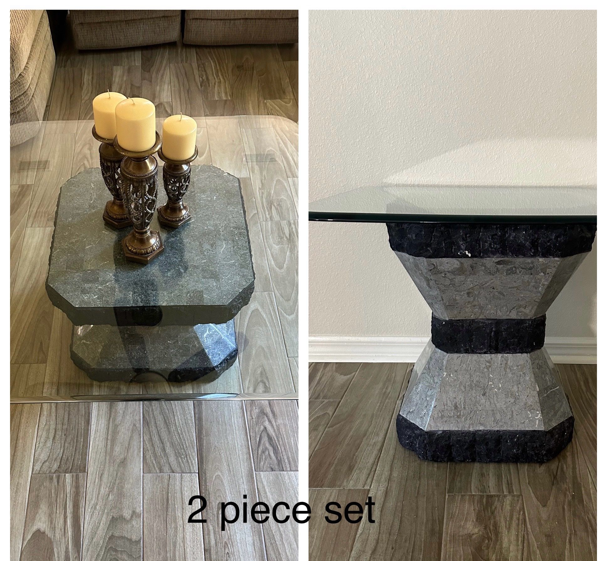Coffee table measures 38” x 38” x 16.5” high End table measures 25.5” x 25.5” x 21.5” high Measurements taken on glass top Great condition!