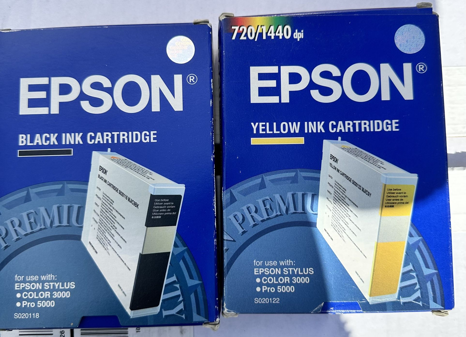 For Epson Stylus 3000/Pro 5000 Model S020118 Model S020122 All are new, unopened. 2 Yellow and 1 black. Genuine Epson ink cartridge.