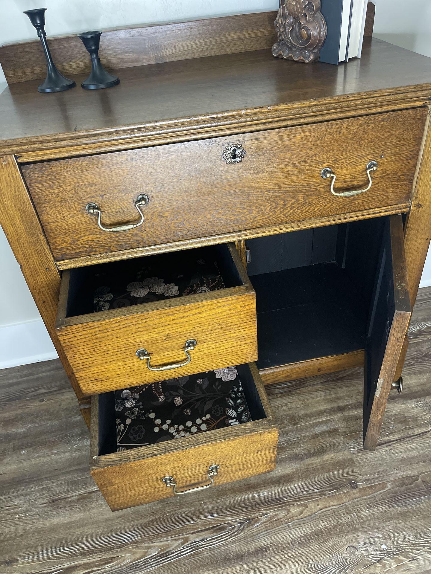 Antique washstand/dry sink on casters that could work well as an entry table, nightstand, or end table. All drawers slide well and casters roll smoothly. 30”w, 16”d, 30”h (33” at the back) Cash only. My items are pre-owned, refinished furniture. They may show signs of wear and age that give them character.