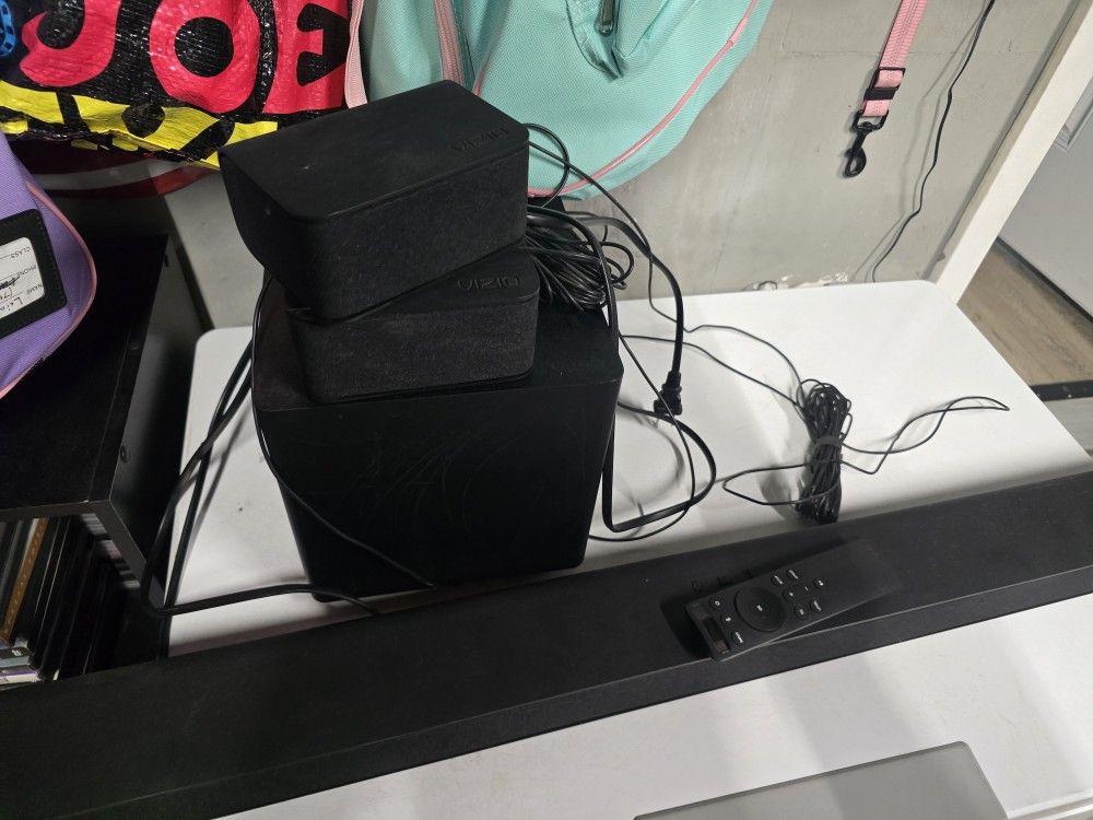 Lg v51 soundbar with bluetooth subwoofer and two additional speakers. Comes with remote and wall mounts. Works perfectly just missing the ac cable which is $5 on amazon.
