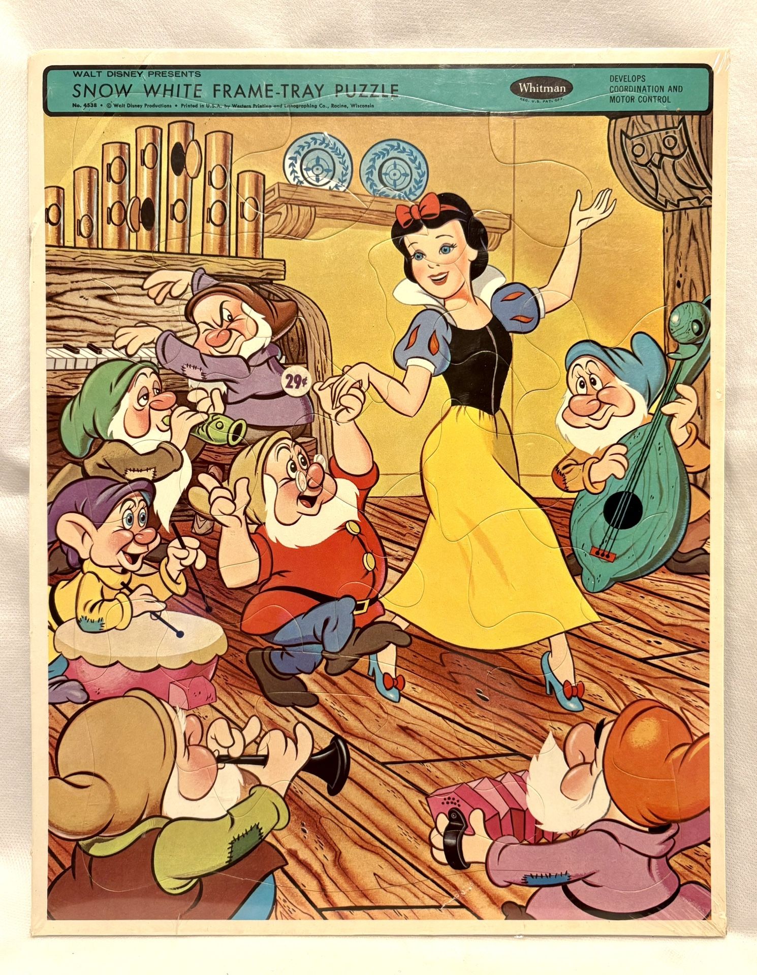 Disney Frame Tray Puzzle Snow White Dancing with the Dwarfs. 1960's. It is a cardboard frame tray puzzle from Whitman for Walt Disney Productions #4538 It is vertically shaped and measures approximately 14" x 11.5". Mint condition, never removed from wrapping.