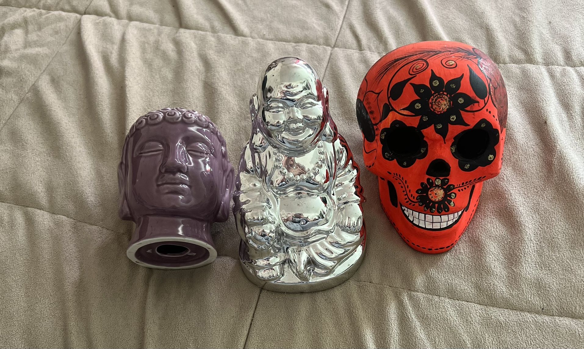 Just getting rid of old things . Clean no chips . Purple one is a candle holder . Orange one can have a candle under it also . Purple : 2$ Silver 3$ Orange : 8$ All for 10$