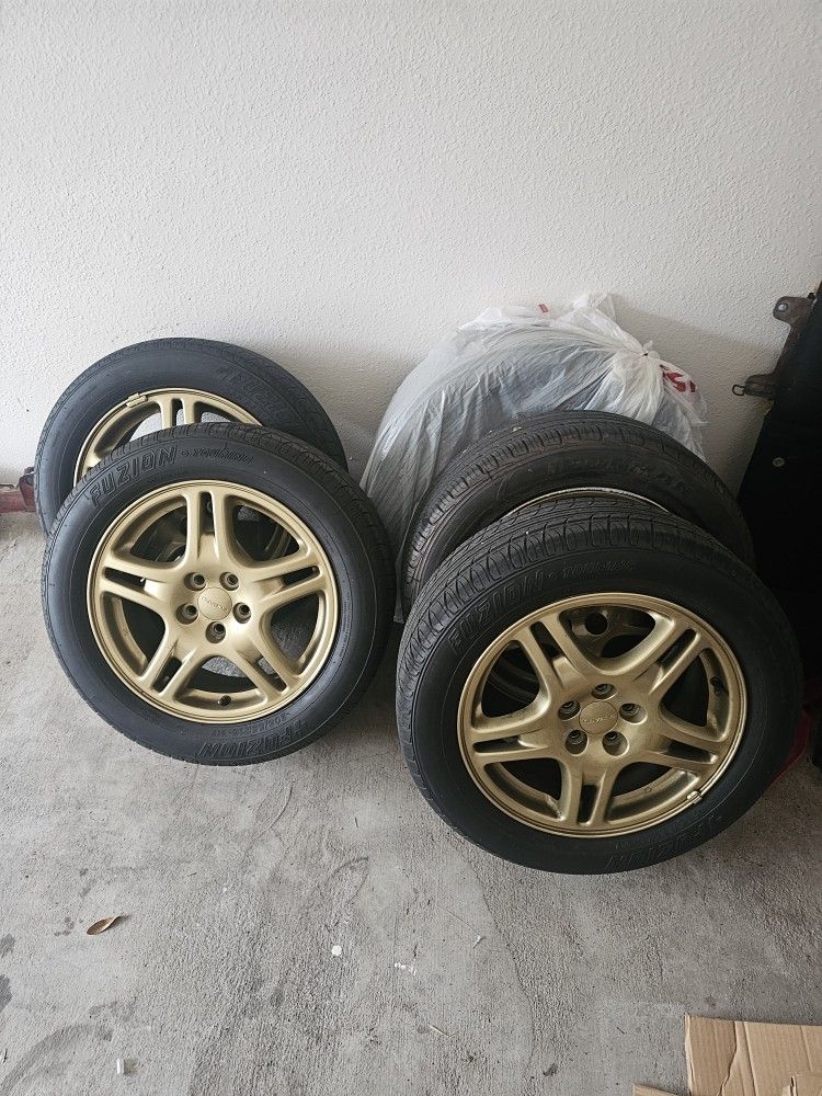 Subaru gold wheels. $150 - Tires are old. Short ram intake and heat shield -$100. Unmarked td04 turbo (housing leak) -$75. Stock sti suspension -$80