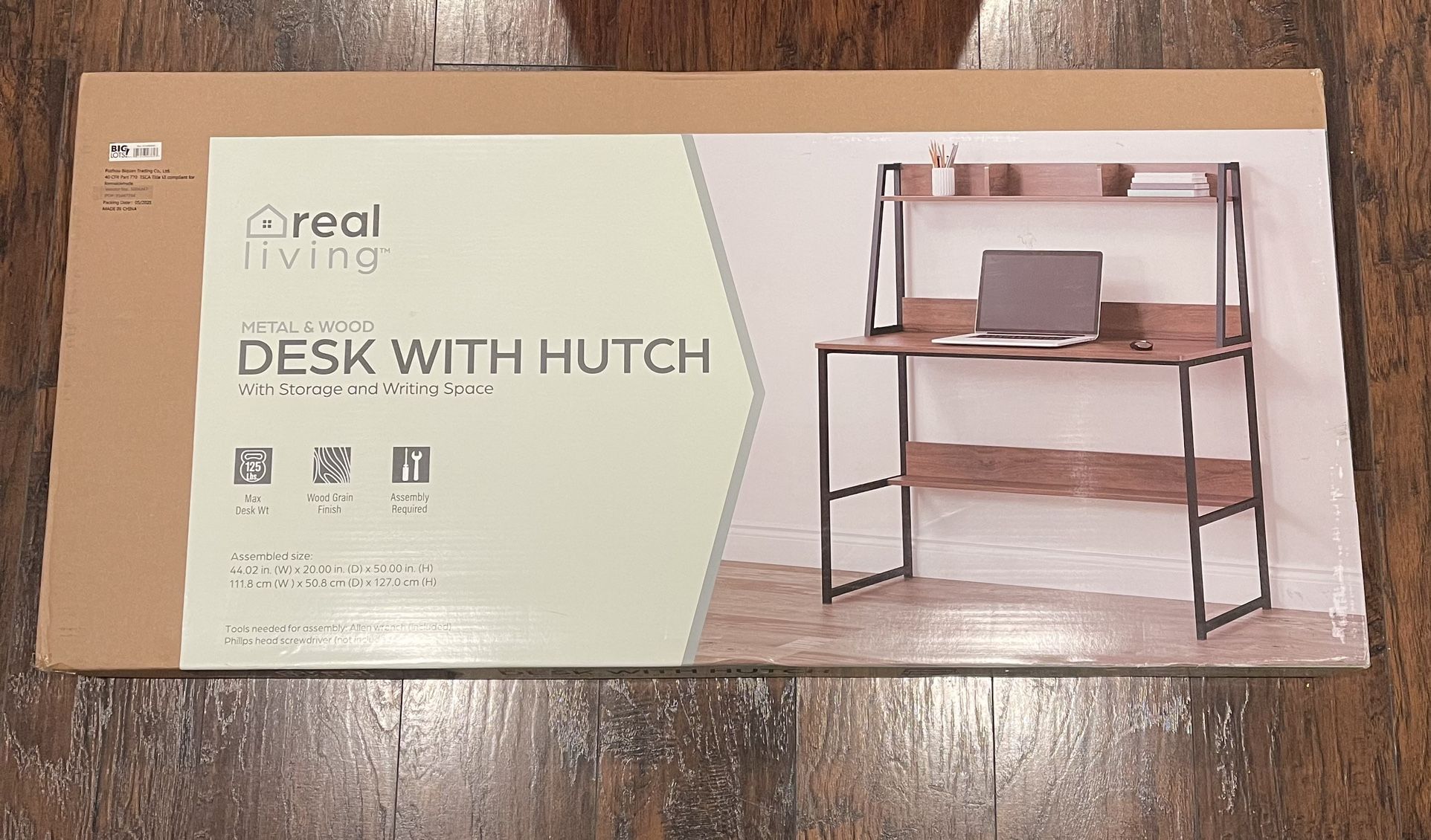 UNBOXED Brand new metal & wood desk perfect if you are working from home, a student, or gamer. This neat desk has shelving above and below the table top, allowing for considerable storage. It is easy to assemble and an Allen wrench is included for assembly. Have multiple. Pick up only! Dimensions: 44.02 in. (Width) x 20.00 in. (Depth) x 50.00 in. (Height)