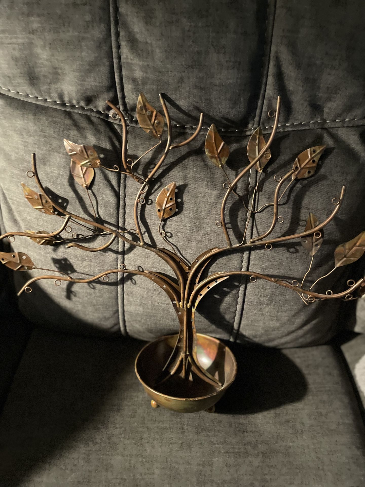 This unique item is a Ancient Graffiti Large Jewelry Tree Stand with Bowl. Crafted from recycled metal with a flamed copper finish, it features a "Tree of Life" design intended for organizing earrings, necklaces, and bracelets. Key Features • Storage: The design includes multiple branches and leaves for hanging jewelry, with some versions featuring up to 16 branches.great for jewelry displays too !!! • Base: It is rooted in a circular metal bowl that functions as a catch-all tray for rings or other items Will meet in shoreline or Camano