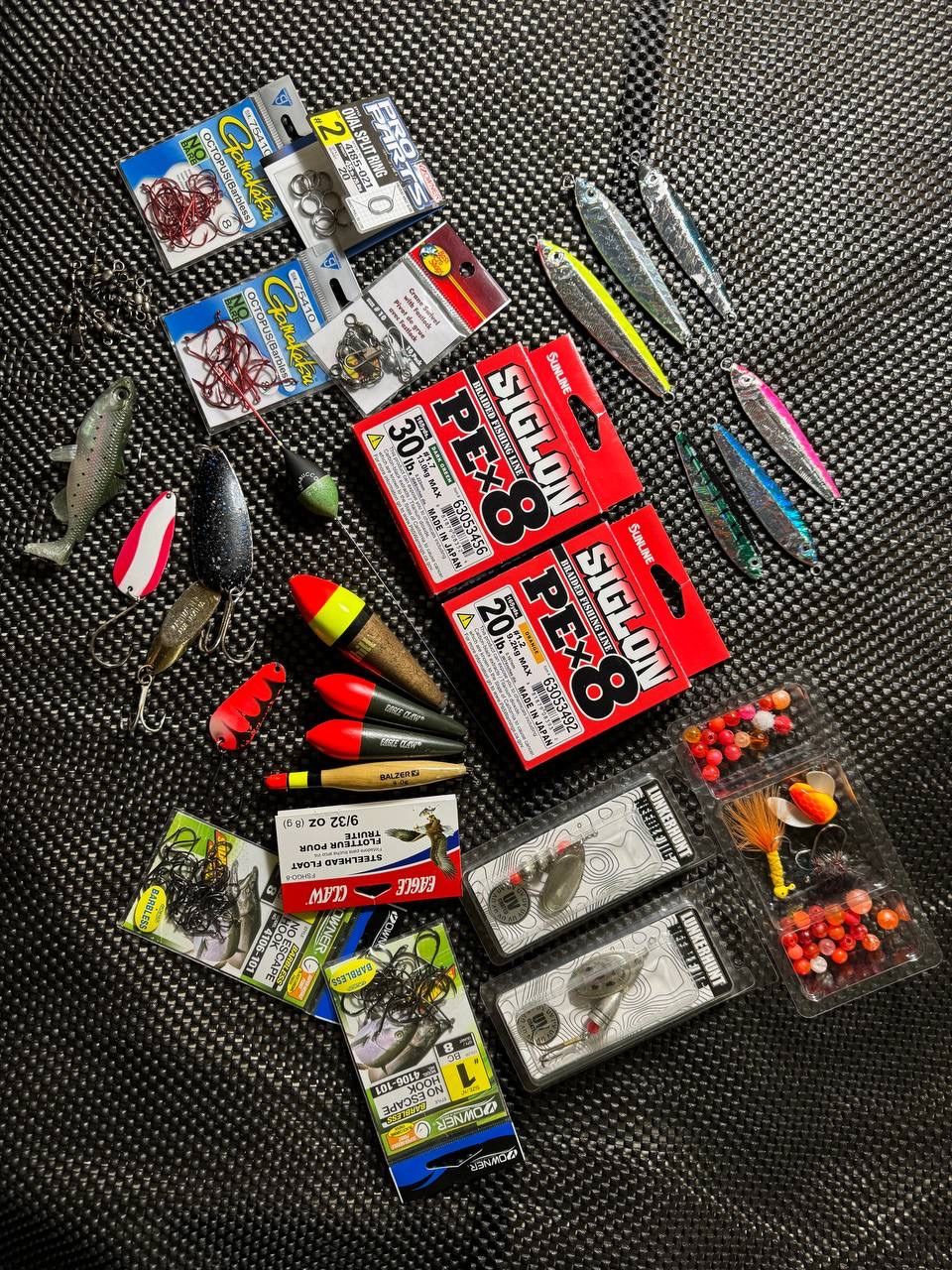 I'm selling everything in the pictures in one lot for catching king salmon, steelhead, trout, bass, striper, and other fish. The price for everything is $79, considering the fishing line alone costs about $40... Receipts included.
