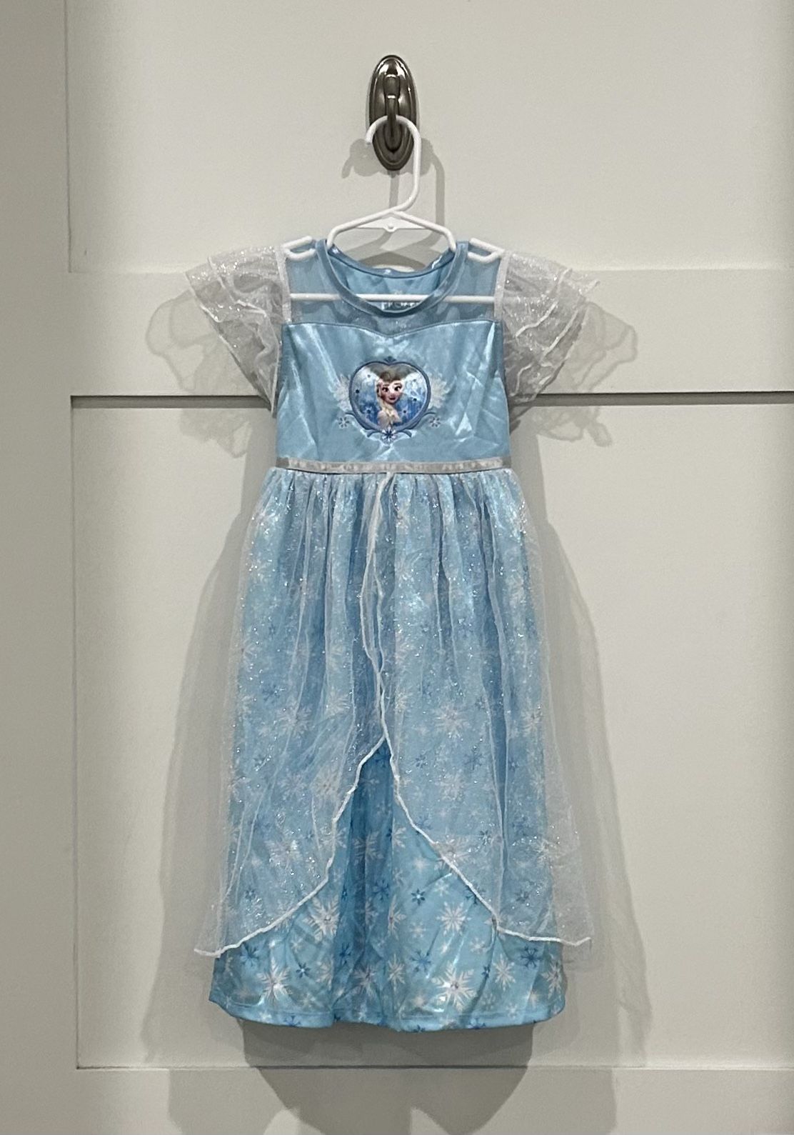 Disney Frozen princess pajamas. Blue, white, and silver. Slips on overhead. Short, ruffled cap sleeves. Sparkly tulle overlay on bottom. Snowflake design underneath. Size 4T. Polyester 11