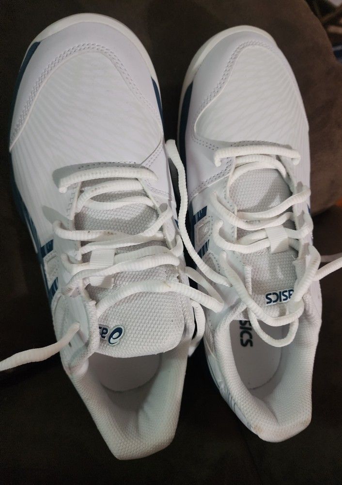 Size 6 Unused TRUSSTIC technology: Improves stability Forefoot GEL technology: Cushioning provides excellent shock absorption Color: White/Mako Blue