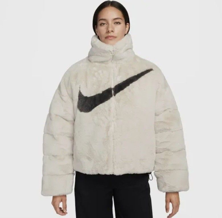 Women's Nike Sportswear Faux Fur Fossil White Jacket [DM1759-238/Large] Features: -Full zip Oversized Faux Fur Jacket -Nike Swoosh logo in front -Ribbed Cuff for snug fit around wrist and waist -Care instruction tag attached inside (Dry Clean Only -Material: 100% Polyester -Style/Model: DM1759-238 -New with original official license tags attached -MSRP: $175 -Imported, Limited