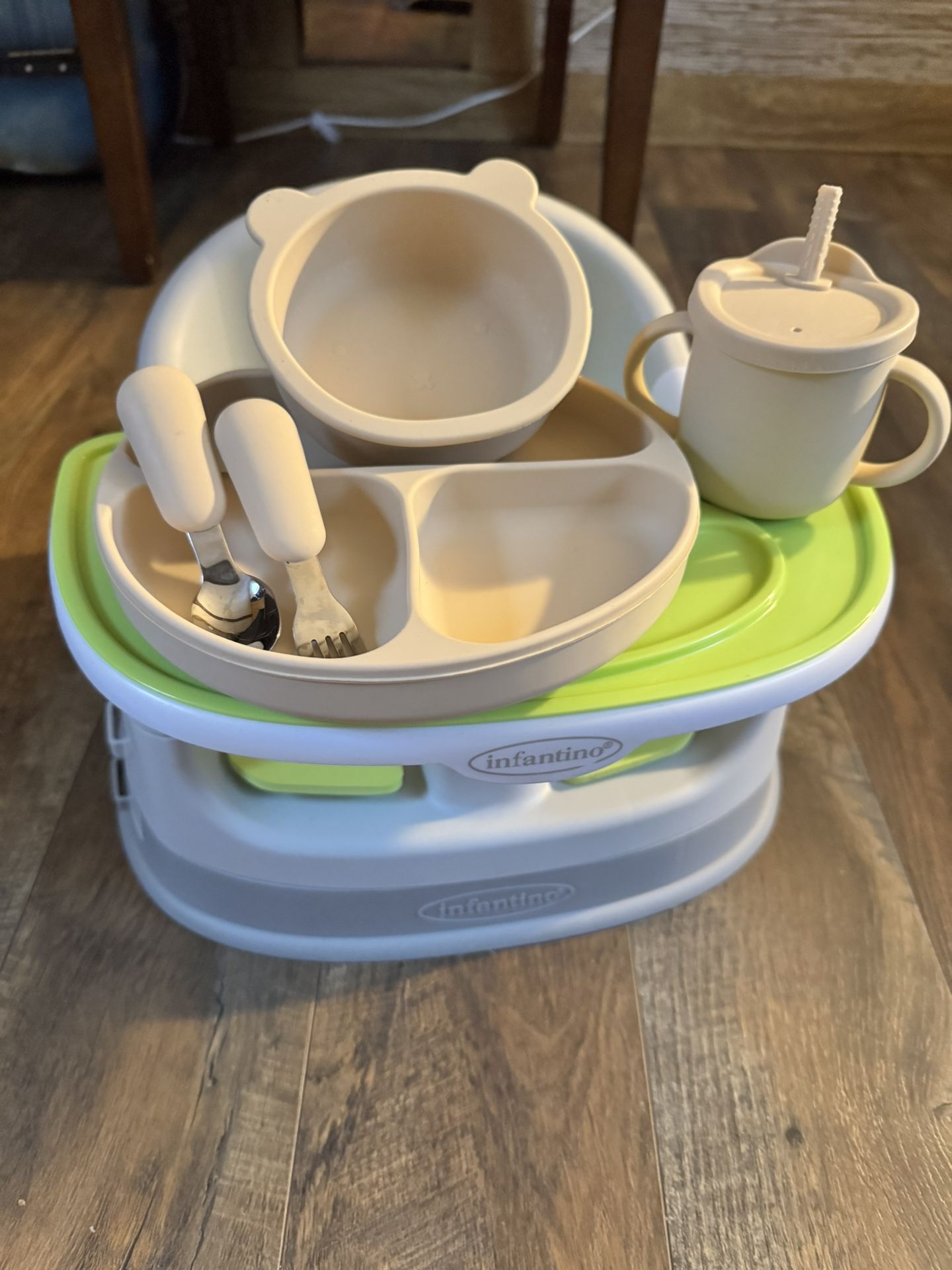Infantino Go gaga! Grow-With-Me 4-in-1 Two-Can-Dine Deluxe Feeding Booster Seat Including Silicone Baby Feeding Set, Baby Led Weaning Supplies with Suction Bowl Divided Plate, Toddler Self Feeding Dish Set with Spoons Forks Sippy Cup