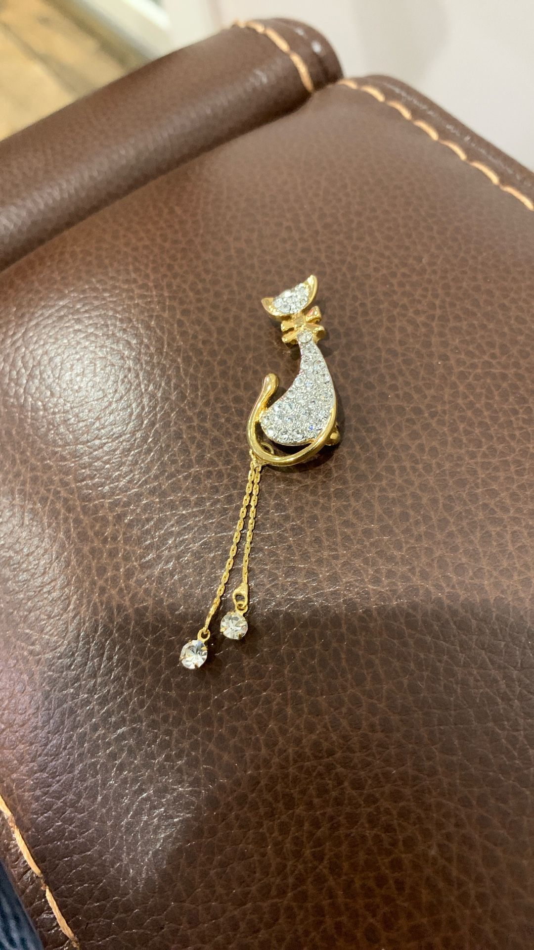 This is a gold-tone cat brooch with rhinestone and dangling chain details