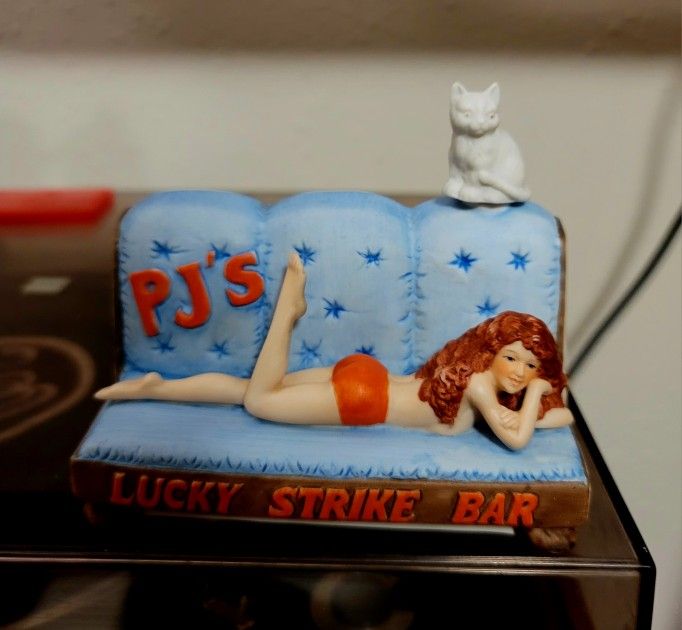 Super fun 80s vintage Dug's Famous Blue Mai Tai bottle from PJ'S Lucky Strike Bar with a rare business card included. These bottles were available at numerous brothels around Nevada and are a great collectible. Rare to see them in such great condition. The cat on top of the couch has a little cork underneath it and serves as the lid to the bottle.