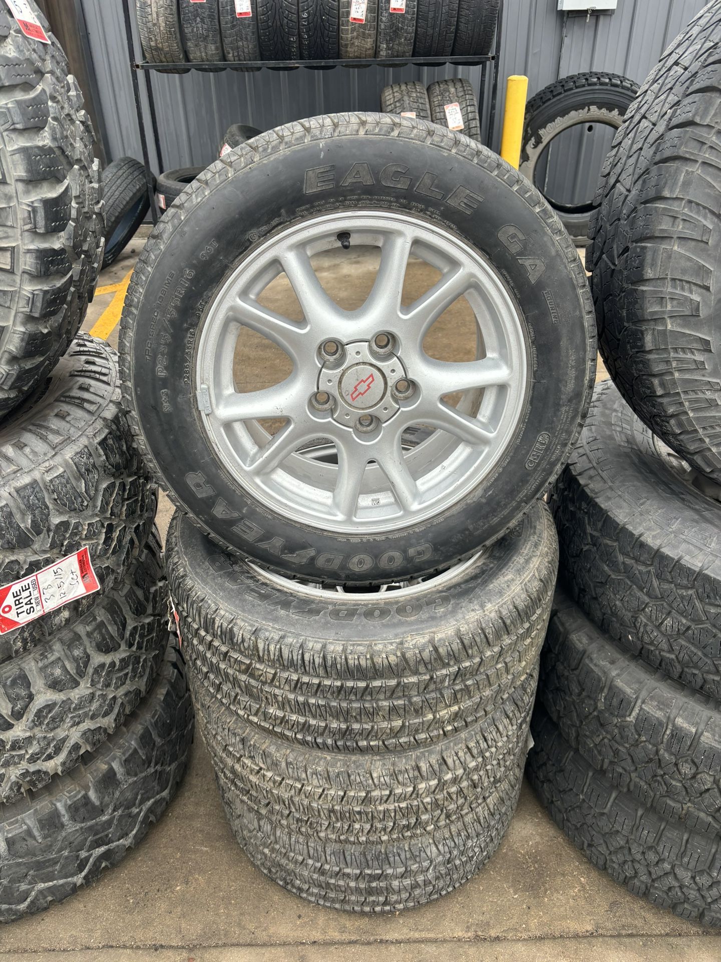 Wheels: 16" x 8" Cast Aluminum ZQ8 rims Bolt Pattern: 5x4.75" (5x120.65mm) - a common pattern for many 2WD GM vehicles of that era Tires: Goodyear Eagle GA, size P235/55R16 Tread: Tires have good tread left. Condition: Rims are in overall good condition with minor scratches (no major curb rash or bends). Includes: All four wheels and tires, with center caps featuring the red Chevrolet bowtie logo. Perfect for a restoration or an upgrade! The price is for the complete set. INSTALLATION INCLUDED located locally at 1502 locust street (affordable tire) on maps