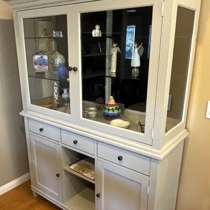 Bassett Studio B China Cabinet Item is in very good condition. Selling: --Bassett Studio B China Cabinet (#4469-K3000)-- Finish Color: Oyster. Back Panel: Ebony. Hardware: Brass. This custom China cabinet has a mid-century modern aesthetic with clean lines and is a two-piece hutch top display section with glass doors and a bottom storage buffet with open bottom center. Dimensions: 59” Wide. 21” Deep, 77” Tall. Retail Price: $3,200 Please see photos for more details and to assess the condition yourself. I also have a matching table for sale. Also be sure and check out the other items I have for sale and message me if you have any questions. Thank You.