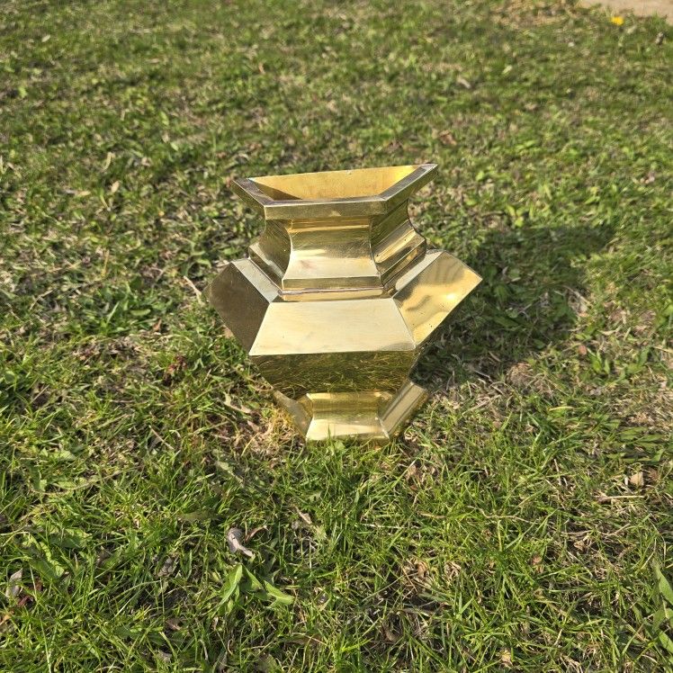 Brass hanging wall vase. 8in tall, 8in wide, 4in deep. With hole to hang directly on the wall. Great for dried flowers, trinkets, and more.