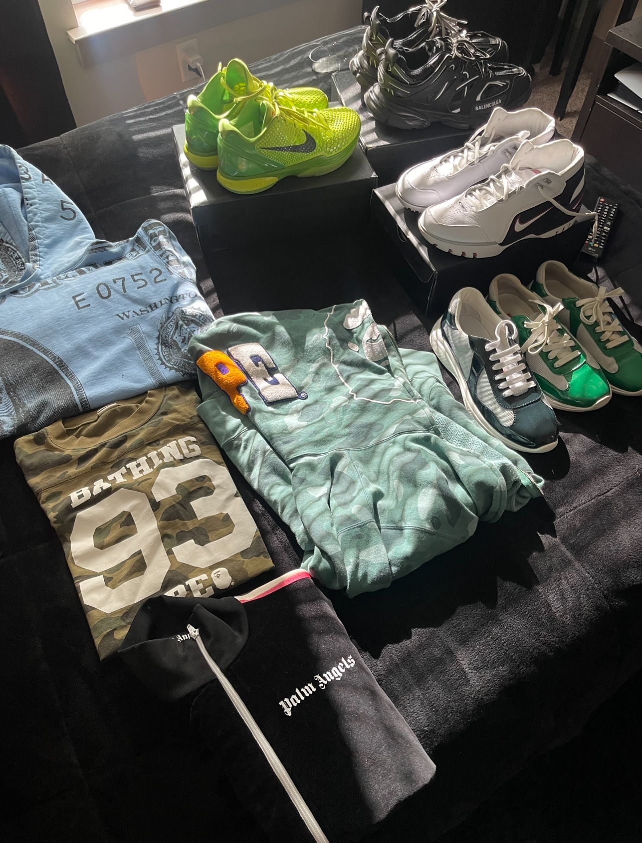 $250 for everything if you can come to me medium supreme hoodie, medium bape tee and hoodie, Palm Angels track jacket Sz M Nike LeBron Zoom 1 sz 10.5, Balenciaga Track 2 sz 44.