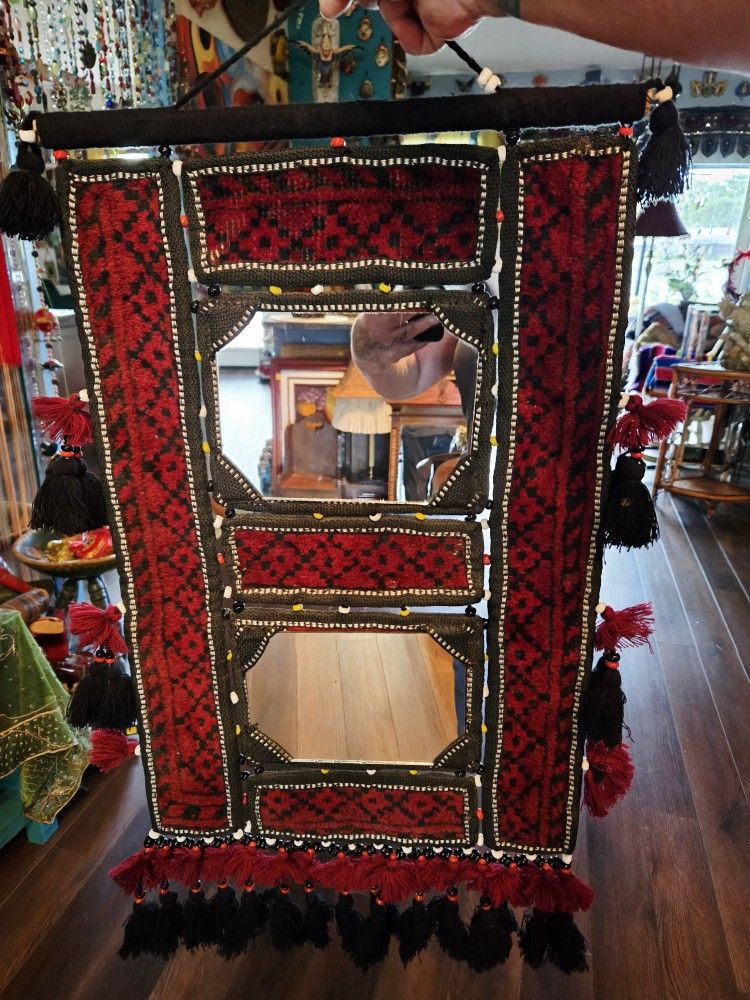 Vintage Handknotted Woolen Mirror Afghan Artisan Folk Art 27.5"×14.5"