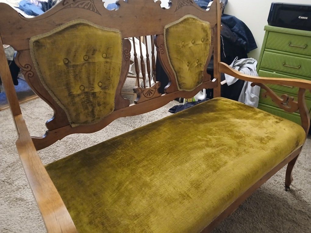 Antique Victorian settee, often referred to as a "love seat," likely in the Eastlake style, featuring carved wooden details and velvet upholstery. Make an offer please.