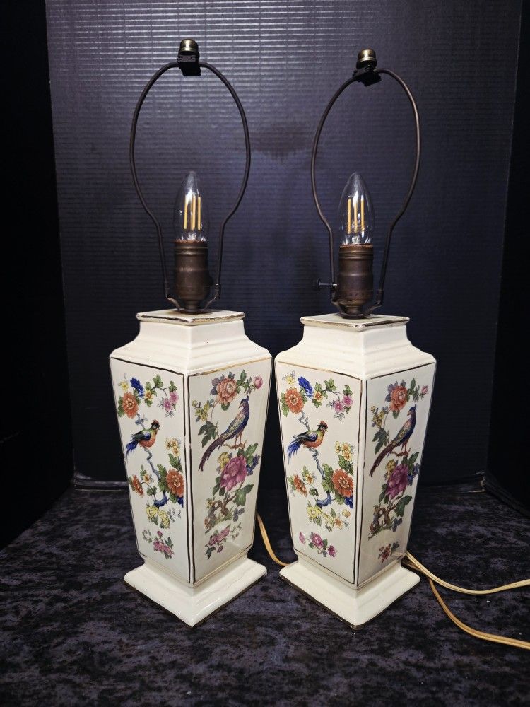 2 Vintage Mid Century Porcelain Birds Motif Parlor Lamps CZECH Republic 21"w/ Shades