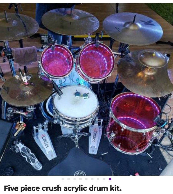 Four piece crush red acrylic jelly Bean kit. Drums floor tom legs cases and two stand mounts and mounting arms for the mounted toms. No stands no cymbals and no pedals. All three toms are acrylic red the kick drum is acrylic clear they have LED lights in them on the tops and bottoms of each film there are two line of feather cracks in a 10-in Tom which is hidden on the bottom so it can't even see it when the kit set up does not affect the sound and then there are two cracks on the kick drum does not affect the sound they were glued and one near the Spurs so you can't even see it the other one is somewhat noticeable but that's why I'm selling them a huge discount. 10 inch Tom with the Tom mount a 12 inch Tom with the Tom mount a 14 inch floor tom with Tom legs and a 22 by 16 kick drum acrylic clear direct message me I have two videos explaining everything about drums about the lighting about everything. Thank you, GG