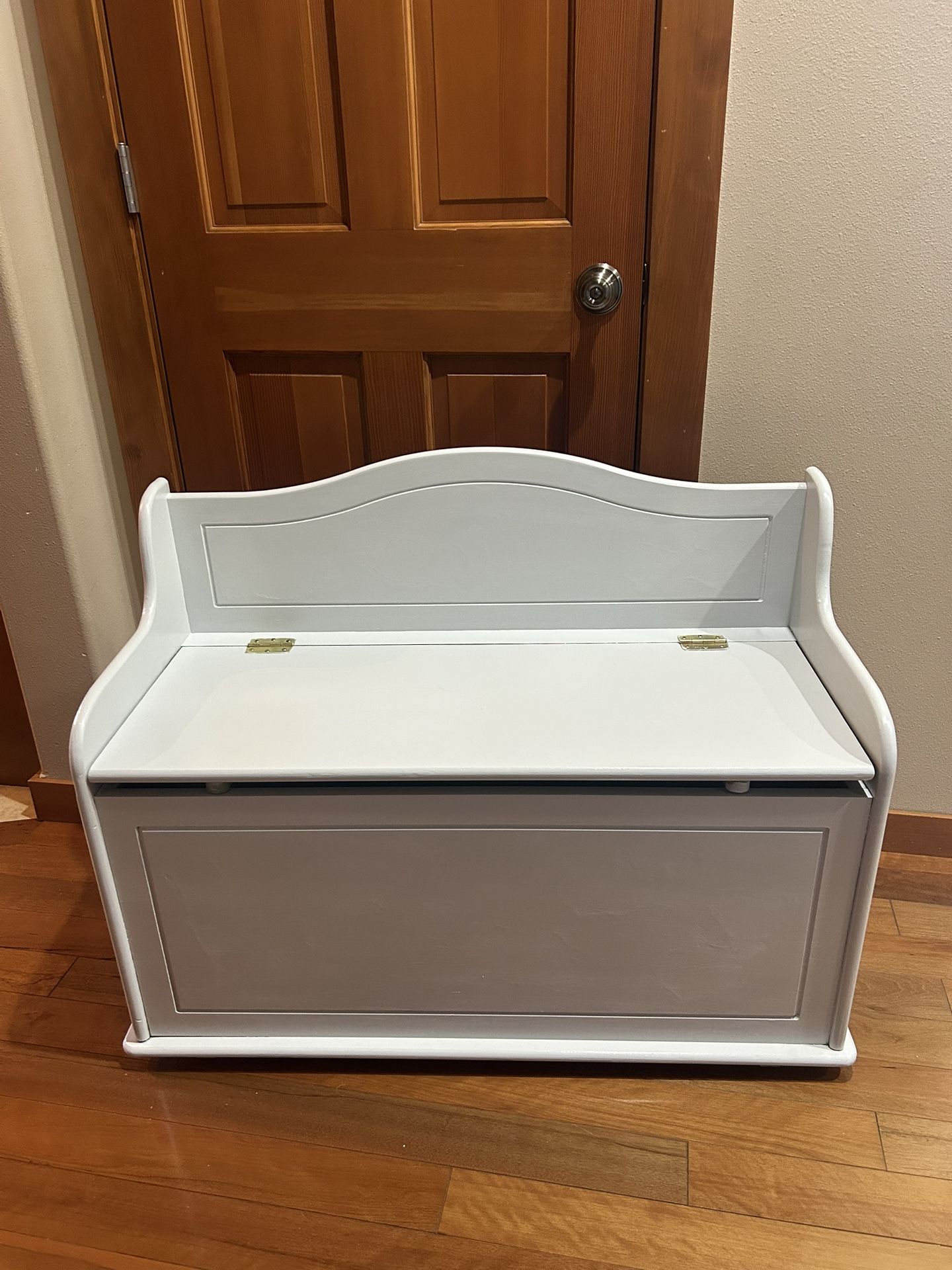 38”x17”x18.5 tall to lid. 29” tall in back. Solid pine wood painted white with a light green stain on the inside. Slow closing hinges with gap. No pinched fingers. In good condition.