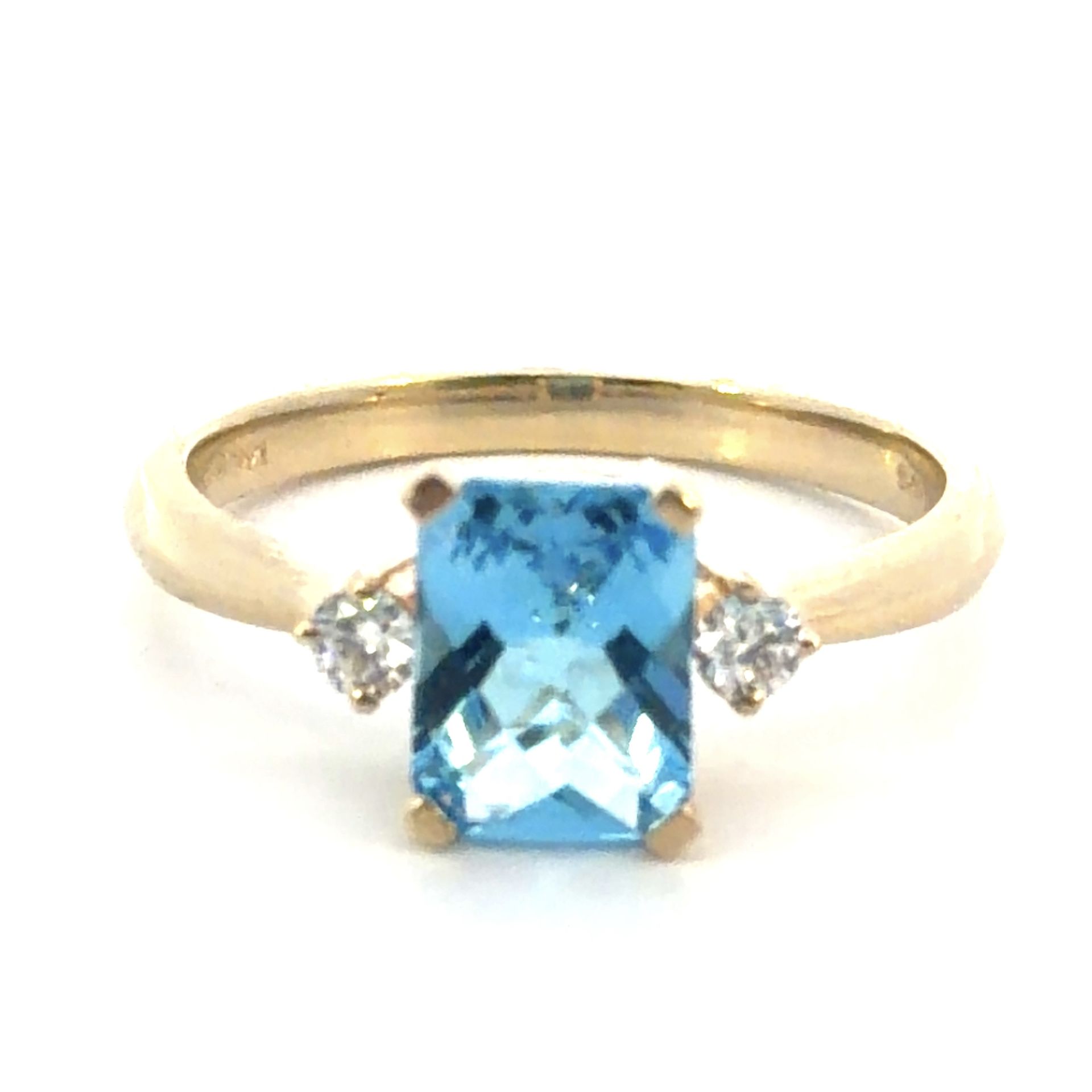 Woman’s Ladies 14k Yellow Gold Emerald Cut Blue Stone and Diamond Ring Size 7 GP3128535