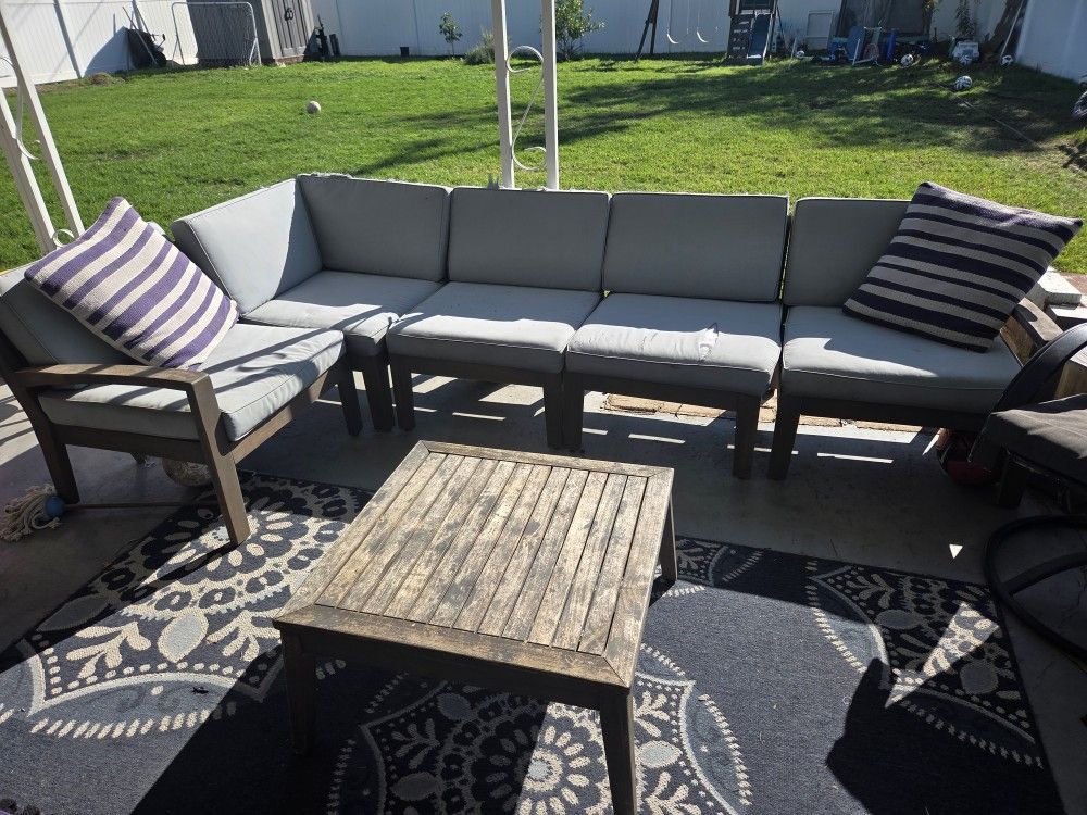 Free sectional and table available for pickup near the Brea Mall. Needs new cushions. Frame and table are distressed, but not broken. Long side is roughly 108", L side is about 55".