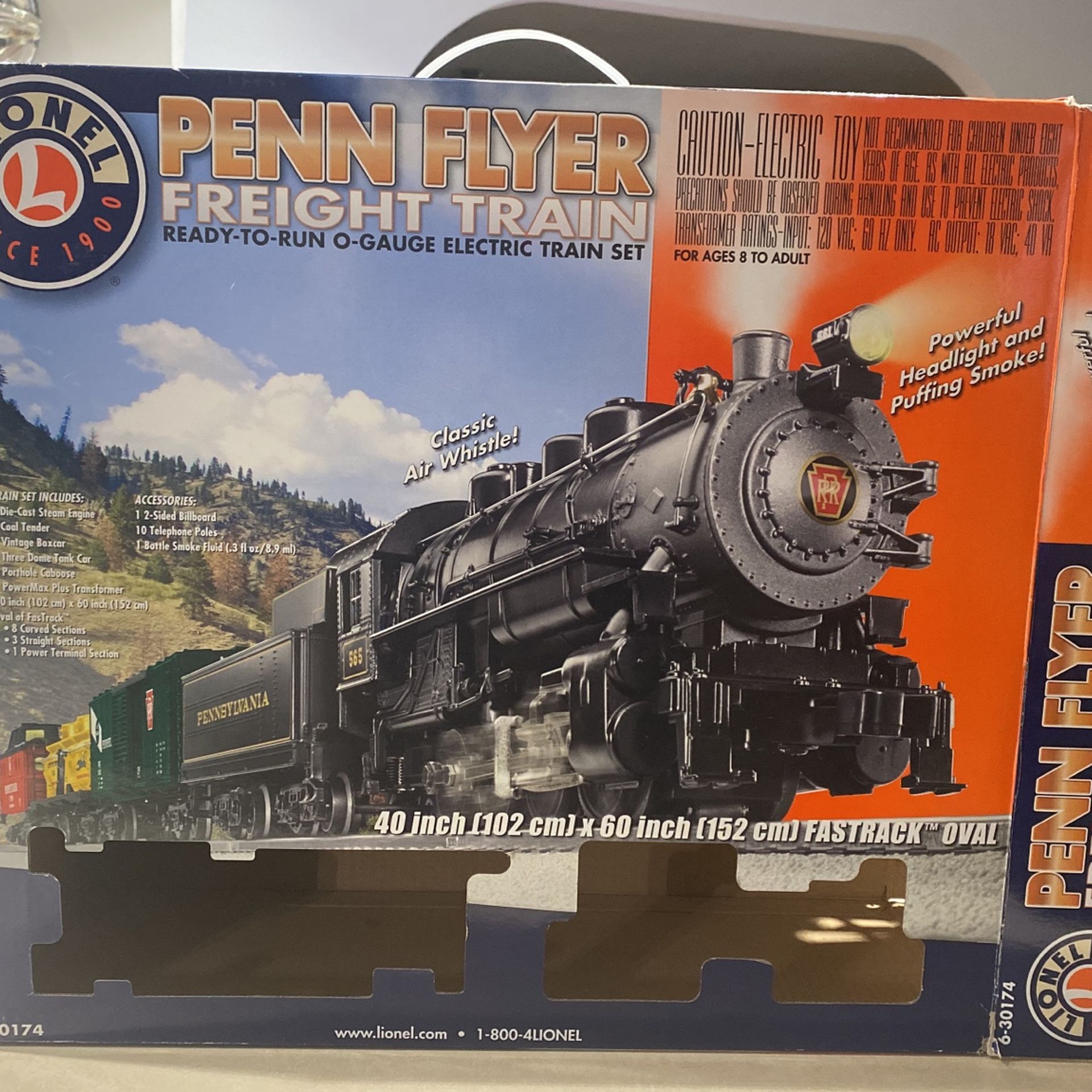 LIONEL PENN FLYER Freight Train. Ready to run a gauge electric train set includes: • 1 diecast steam engine • 1 call tender • 1 vintage boxcar • 1 tank car • 1 porthole caboose • 1 port max plus Transformer 40” x 60” oval FasTrack (8curved; 3straight; 1 power)