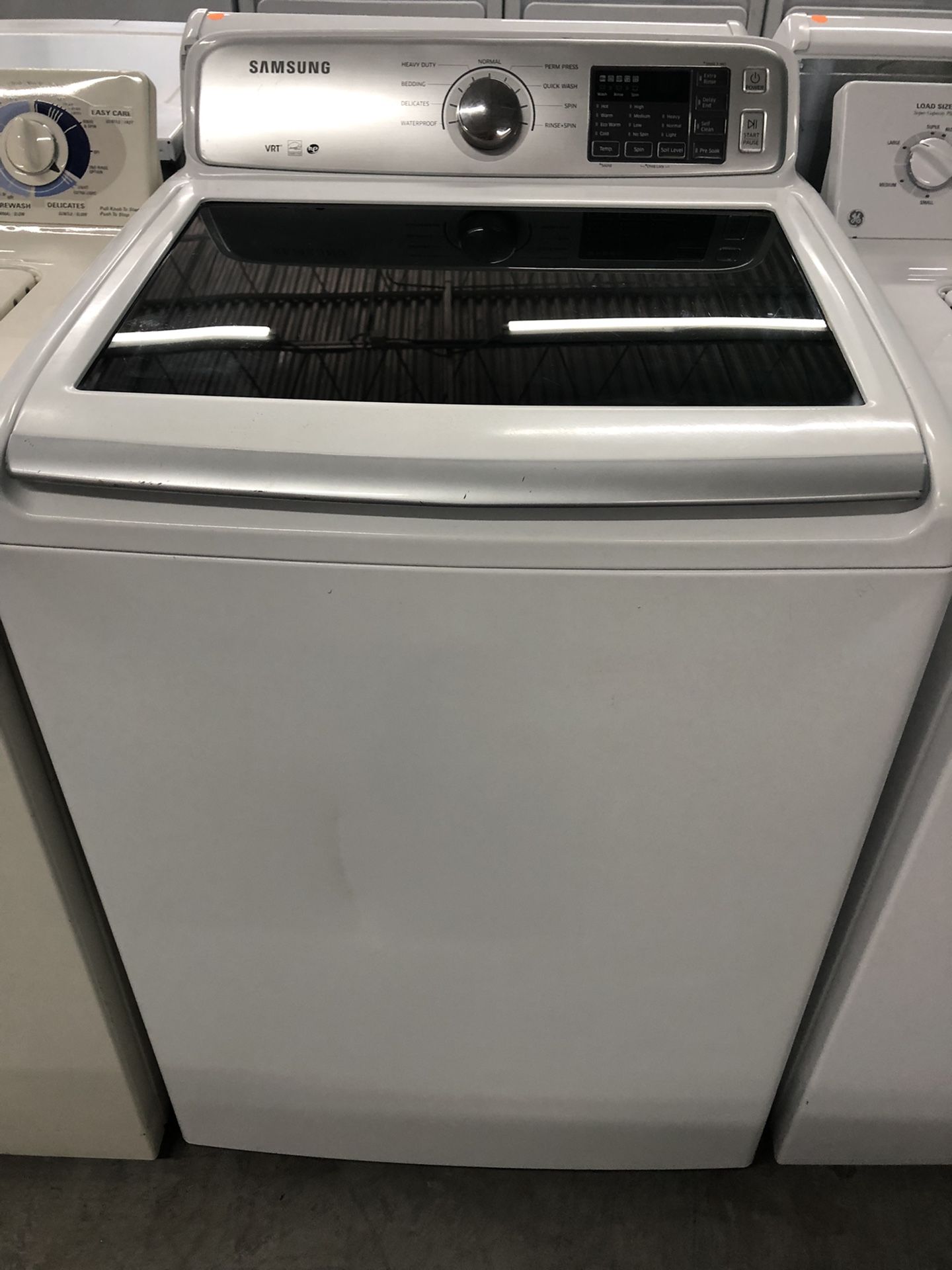 Samsung top load washer with glass top and no agitator. Washer has stainless tub 12 cycles optional extra rinse delay start pre soak and self clean. Comes with 120 day warranty. Financing and delivery available.