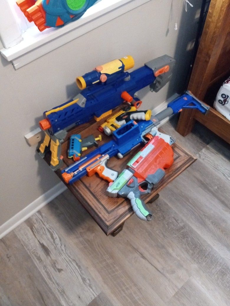 Contain Nerf Vigilon, Nerf flip 16, Nerf longshot cs-6, Nerf raider cs-35, , Nerf Fortnite bus mini, Nerf mod 11321 and a bakers dozen darts.