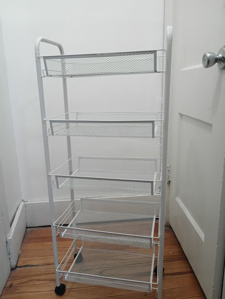 New, never been used 5 Tier All metal Rolling Rack with 360° Swivel Wheels (2lock) Shelves are mesh wire metal. 40 1/2" H 17 1/4" W. 10" Deep Available in WHITE or BLACK