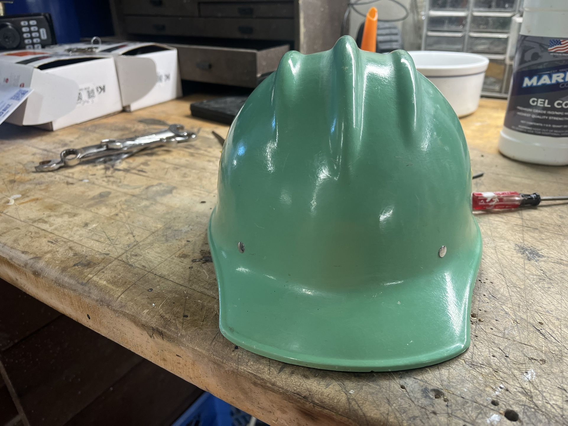 The pictures are before and after I cleaned it up, used to be a welders hard hat it has four 3/32 holes where the clips were.