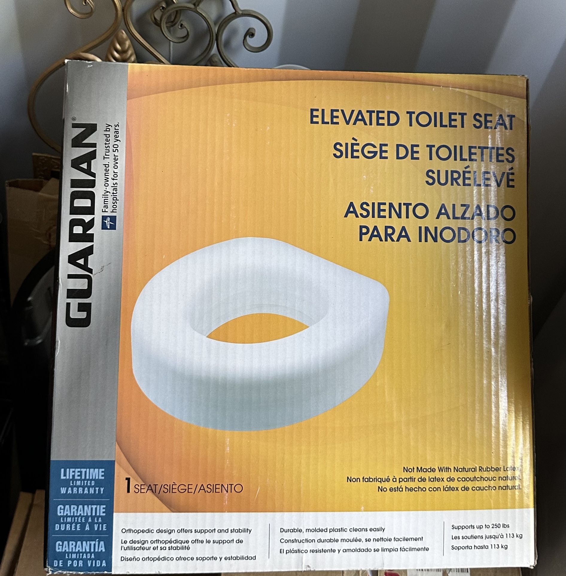 Elevated toilet Seat Orthopedic design offers support and stability Le design orthopédique offre le support de l'utilisateur et sa stabilité Diseño ortopédico ofrece soporte y estabilidad New Pick it up near Kiest park Dallas Texas 75224 Shipping available