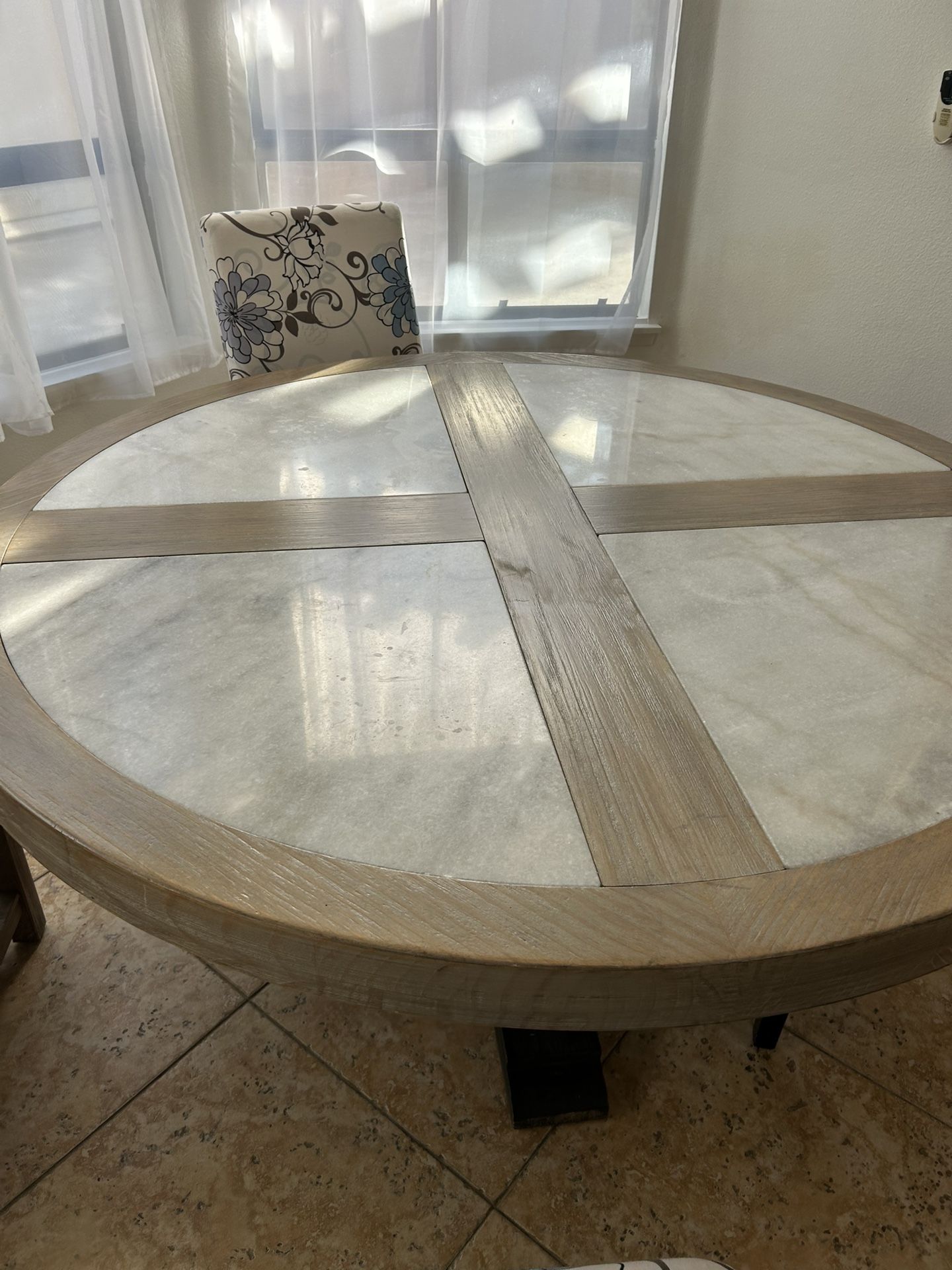 Beautiful round dining table. 4 Marble pieces and top can come off base so easy to transport. Very nice finish. Base has beautiful design. Some wood areas chipped. Would like something smaller in my kitchen. Great buy!!