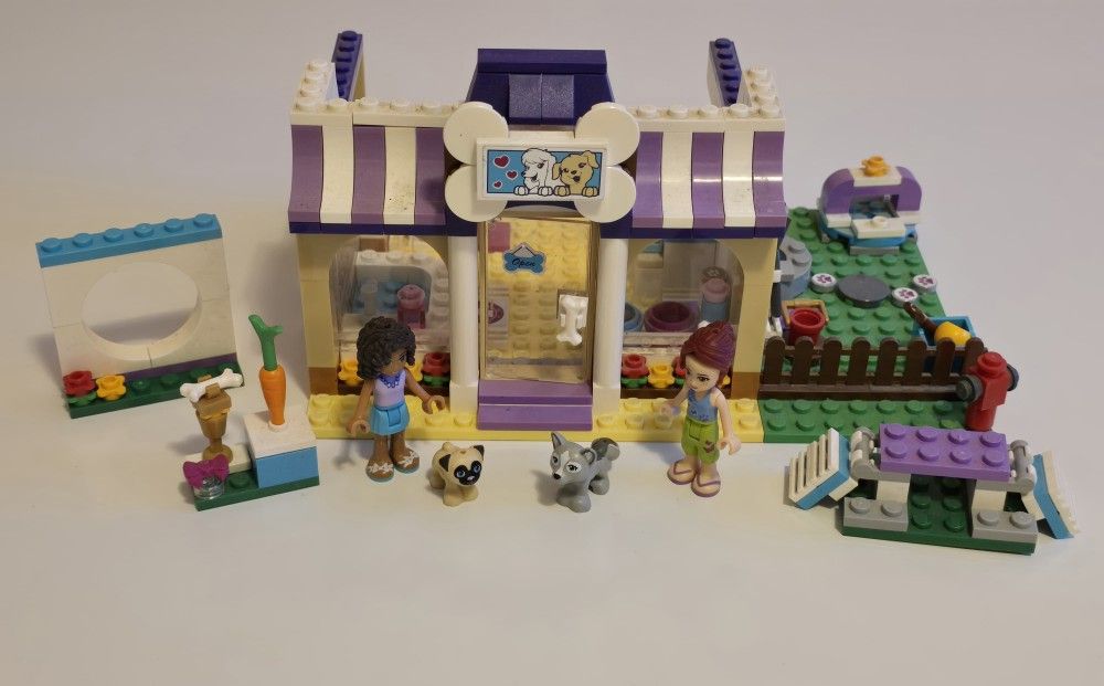 This retired LEGO Friends Heartlake Puppy Daycare (Set #41124) is ready for a new home! The set is already assembled, featuring the daycare building with its opening doors, the outdoor agility course, and the adorable husky and pug figures. The original building instruction booklet is also included with the set. Please note that the pieces may be a little bit dusty from being on display, but a quick rinse with mild soap and water will have them looking brand new again. This set is being sold with all pieces included—there are no missing pieces, making it a 100% complete set for any animal lover's collection!
