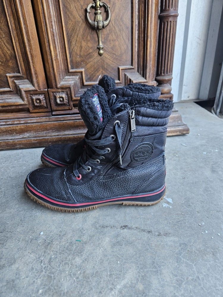 Pajar waterproof insulated winter boots in black leather with fleece lining and durable rubber outsole featuring maple leaf traction. Side zipper and lace-up front for secure fit and easy on/off. Excellent pre-owned condition with normal cosmetic wear. Soles show minimal wear and plenty of life remaining. • Brand: Pajar • Waterproof construction • Insulated fleece lining • Side zipper + lace closure • Maple leaf traction outsole • Size: US 10–10.5 / EU 43 • Made in Canada brand heritage Warm, durable winter boots built for snow, ice, and cold weather.