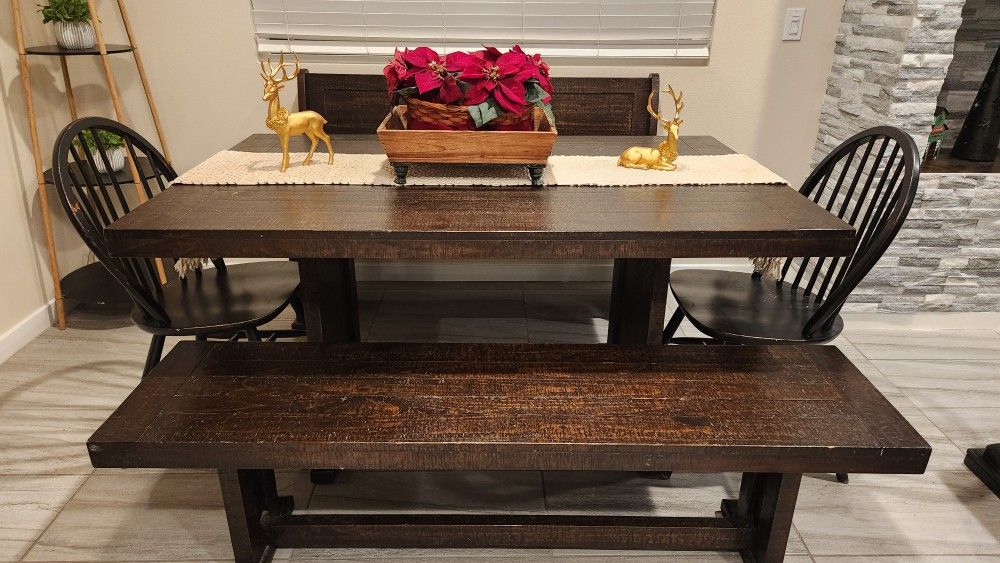 Farmhouse Style Dining Table With Chairs & Benches In Nice Condition 30X60X38 Table Measurements Includes 2 Benches & 2 Black Chairs Has minor blemishes $395 - Located in Lake Elsinore