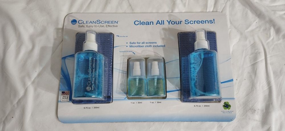 Brand new screen cleaner for all device screens, computer tv's and even eyeware. Includes: Two 6.75 bottles for home. Two 1 oz bottles for travel. Brand new in package, never used.