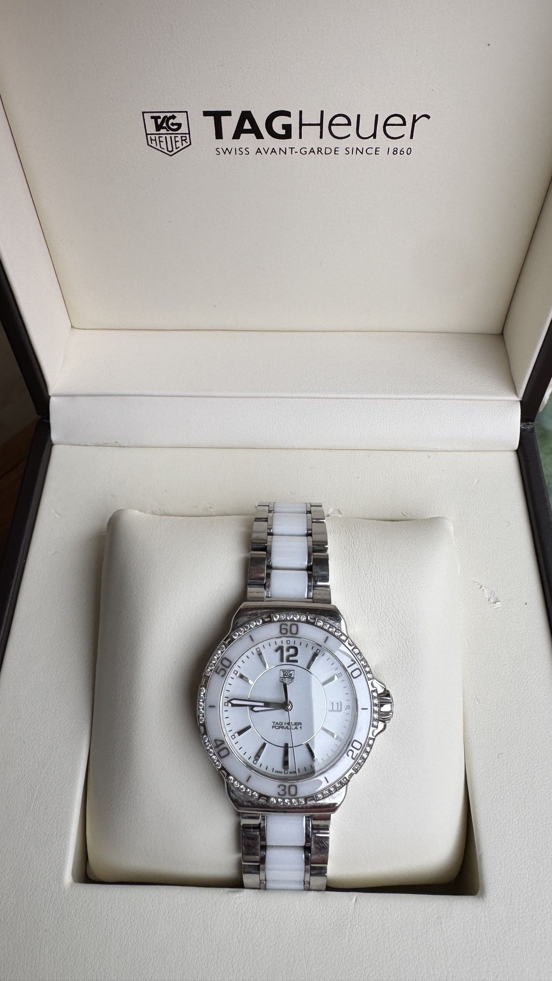 TAG HEUER FORMULA 1 F1 CERAMIC QUARTZ WOMEN'S WATCH Store Display Model (What's This?) - With Manufacturer Serial Numbers - Swiss Made - White Dial - Index Hour Markers Arabic Numeral 12 Hour Marker - White Ceramic Bezel Set with 60 Diamonds Arabic Numeral 60 Minute Graduations Printed on Bezel - Date Feature - Battery Operated Quartz Movement - Certificate of Authenticity - Manufacturer Box & Manual - Polished Stainless Steel Case - Polished Stainless Steel with White Ceramic Bracelet - Scratch Resistant Sapphire Crystal - 200 Meters / 660 Feet Water-Resistant - 37mm = 1 1/2" Case, 6" Adjustable Bracelet - Case Thickness: 10mm - Inlet Size: 17mm - Unidirectional Rotating Bezel - Luminescent Hands & Hour Markers - Screw Down Crown & Case Back - Deployment Buckle
