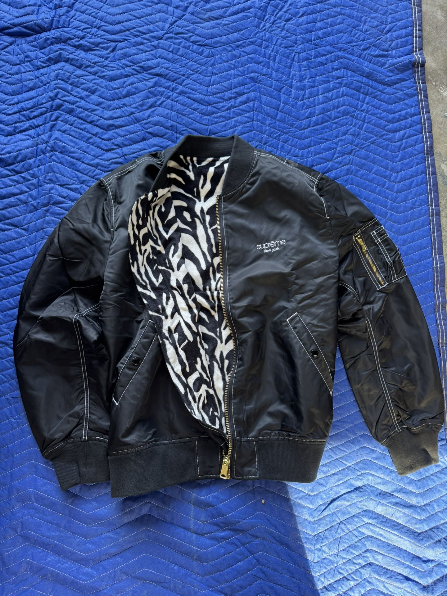 Very cool reversible Supreme bomber jacket, black and zebra print. Lightly worn