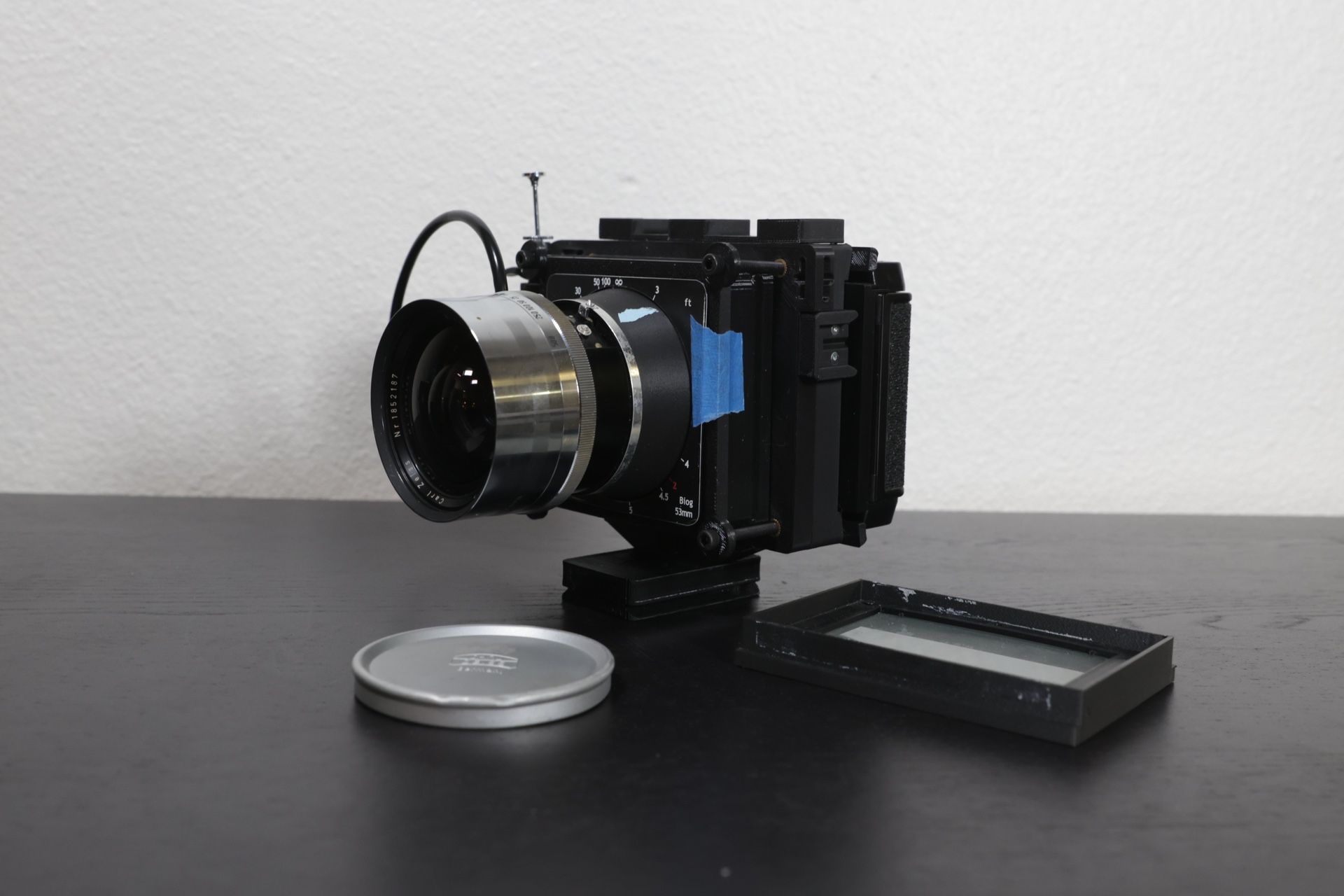 This is a one-of-a-kind custom 3D printed camera from Mercury Works with the wide angle Linhof Carl Zeiss 53mm f4.5 Biogon. This lens has the same lens design as the legendary Hasselblad SWC cameras but the lens covers 6x9. Because of how this camera operates, I would consider it the bigger brother to the SWC. Since it is a Biogon, there is near zero distortion or vignetting. The only thing this camera is missing is a viewfinder but I will include the ground glass for it. It accepts Graflok 2x3 backs which are still available on ebay. This kit includes the 53mm Biogon, Horseman 6x9 120 back (in mint condition with box), a shutter cable, and the 3D printed camera from mercury. Asking $1100 OBO but I am open to trades.