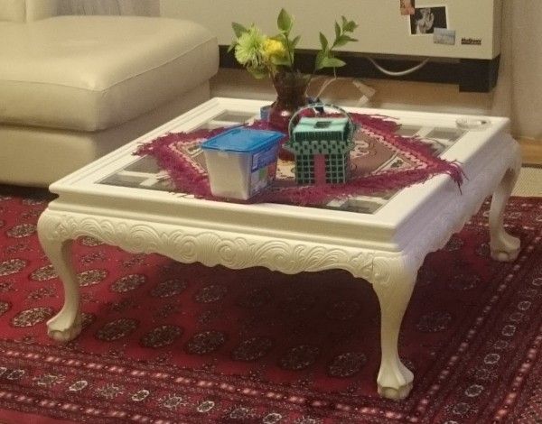 Beautiful Queen Anne-style coffee table with a glass top. Some scratches on the glass. Paint chipping, but it adds to the French provincial look, and if you're handy, you can reprint it. The table comes apart for easier transportation. SIZE: 36"x36"x17"H. Price is negotiable.
