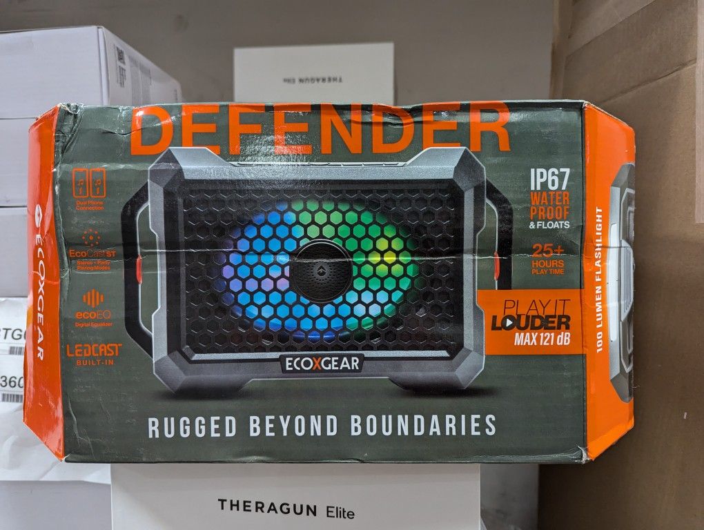 ECOXGEAR Defender Bluetooth Speaker - 100W Waterproof This is one of the loudest, toughest portable speakers on the market—perfect for the boat, beach, or job site. Condition: Brand New / Never Opened / Factory Sealed. Power: 100 Watts of peak power (hits up to 121dB!). Battery: 25+ hours of playtime. Rugged: IP67 Waterproof & Dust proof (It floats!). Features: Bluetooth 5.1, LED Party Lights, built-in flashlight, and a bottle opener.