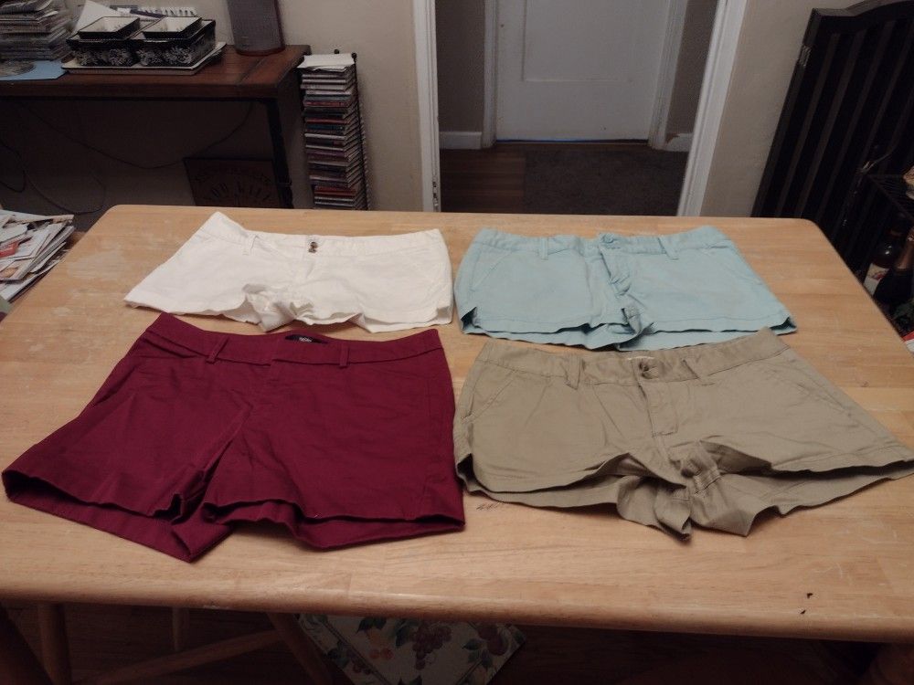 Mossimo ..Burgundy is Size 4, White is size 5, Aqua is size 7 and khaki is Size 7. All in very good condition. $7.00 each .