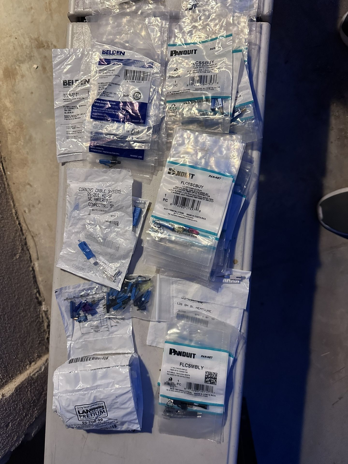 Single and multi mode. Anarobic connectors. Corning unicams. Panduit connectors. Splicing connectors.
