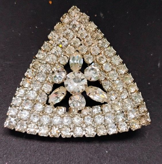 Make a statement with this striking vintage brooch! Featuring original prong-set white rhinestones that shimmer brilliantly, its rare triangular design sets it apart from the rest. A true gem for collectors or those who love timeless elegance.