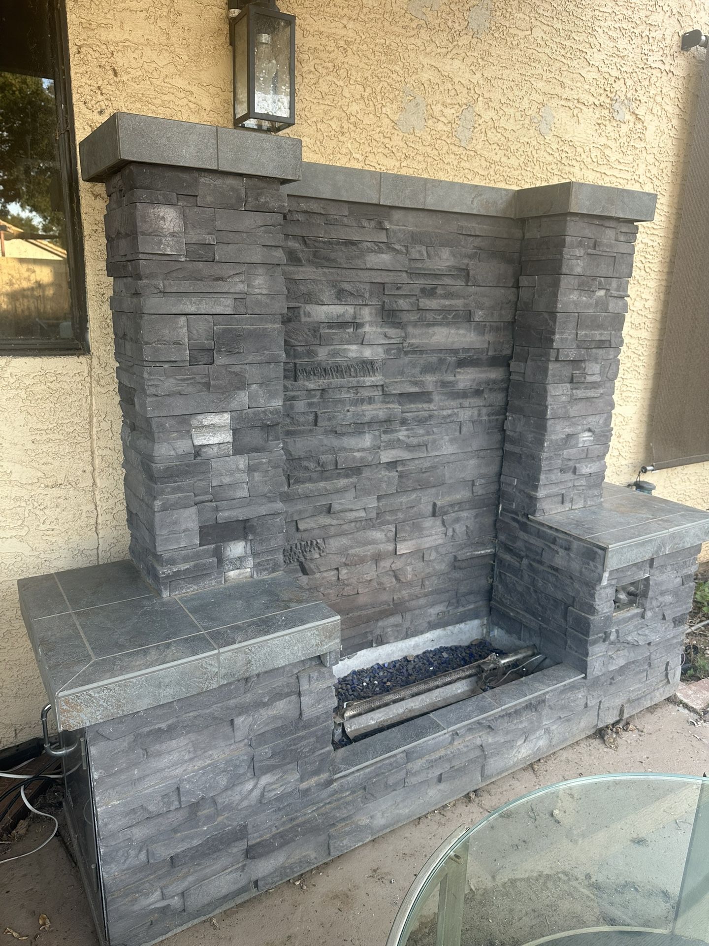 Item is heavy. Two people to move. Dirty. You haul. Includes blue glass. Sellers notes: custom outdoor fireplace; so very cool!! The "Bull Acqua Firewall" refers to an outdoor gas fireplace and waterfall feature, likely from the brand Bull BBQ, that combines fire's warmth with water's sound for a dynamic backyard focal point, offering a unique blend of fire pit and cascading water element, often built into customizable stone or stucco surrounds for patios and pools, enhancing ambiance and usability into cooler evenings. Key Features & Concepts: Fire & Water Combo: Creates a mesmerizing visual with flickering flames reflecting on water, notes AquaBlu Mosaics. Manufacturer: Often associated with Bull Outdoor Products (Bull BBQ). Design: Can be integrated into custom hardscapes, like patios or pool areas, using materials like stone, rock, and stucco. Functionality: Uses gas for the fire, providing warmth and an adjustable flame, while water flows from a spillway, creating soothing sounds. Installation: Available as kits or integrated into larger outdoor kitchens, with components like H-burners, control panels, and optional waterfall/firewood extensions. Benefits: Extends outdoor usability into cooler months, acts as a gathering spot, and adds significant aesthetic appeal.