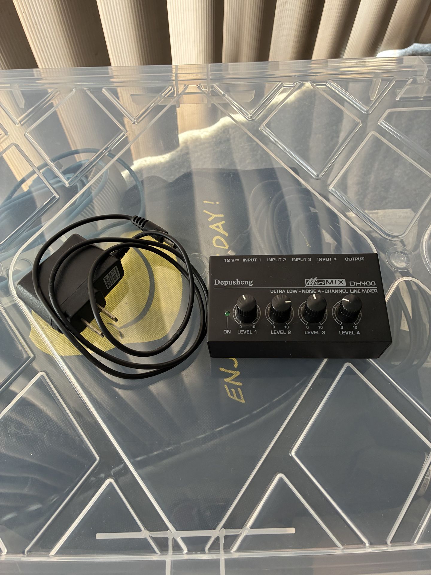Mini 4 Channel Mixer. Comes with power cable. Works great. 4 in 1 out. Convenient for travel. Pick up and cash only. $10 OBO