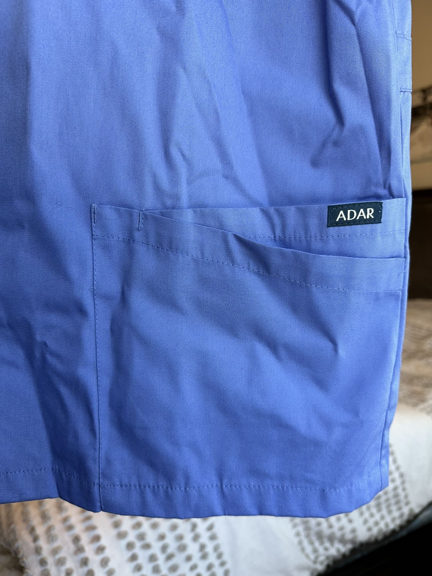 BRAND NEW in box Blue Adar Universal Zippered Coat Unisex Adar lab, pharmacy, hospital coat Short Sleeve Comfortable and easy Light blue Size X-Small but BIG, fits x-small, small and medium
