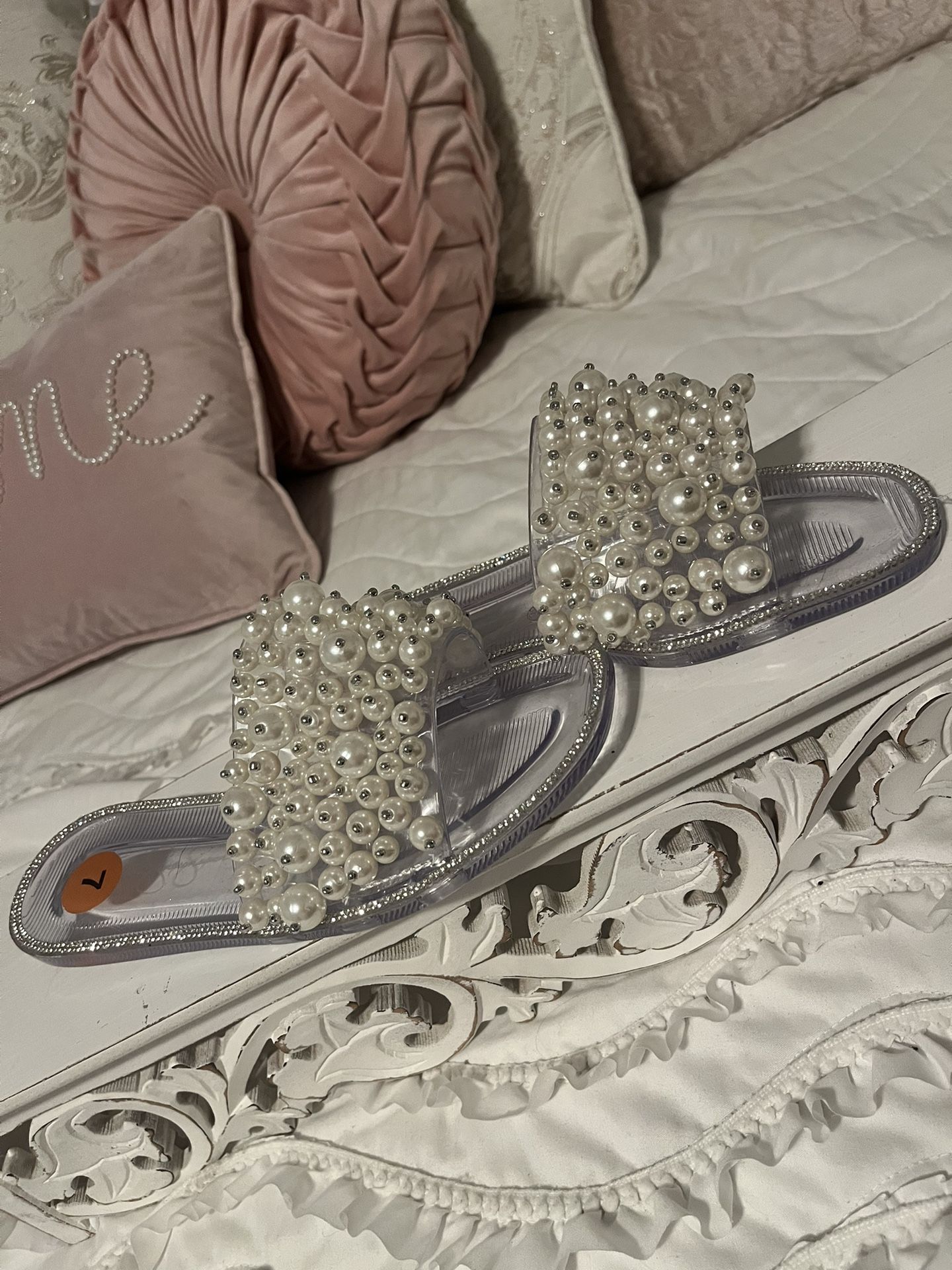 These slip on sandals have never been worn! They are a great comfy yet stylish alternative to heels on a special occasion, or just whenever you want to walk around feeling a little glamorous. They are size 7 and have never been worn.
